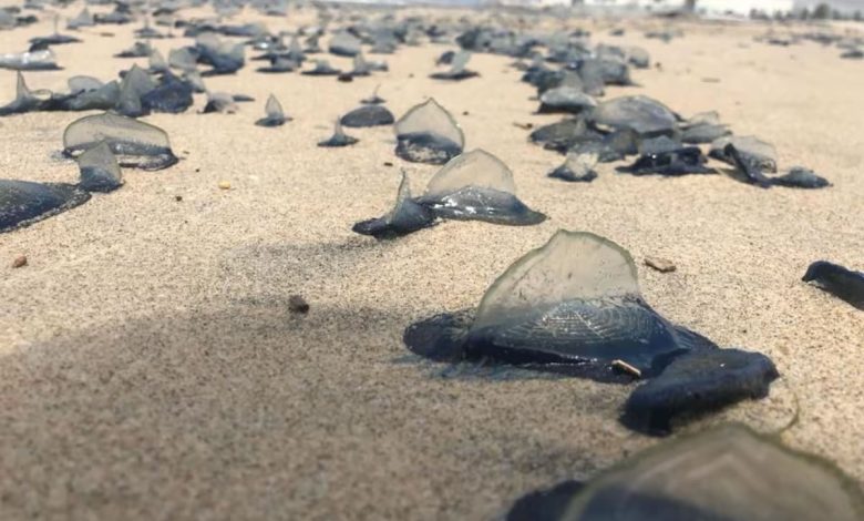 En la playa se pueden observar miles de estos especímenes muertos sobre la arena, en espera de que las olas los arrastren al mar de nueva cuenta.